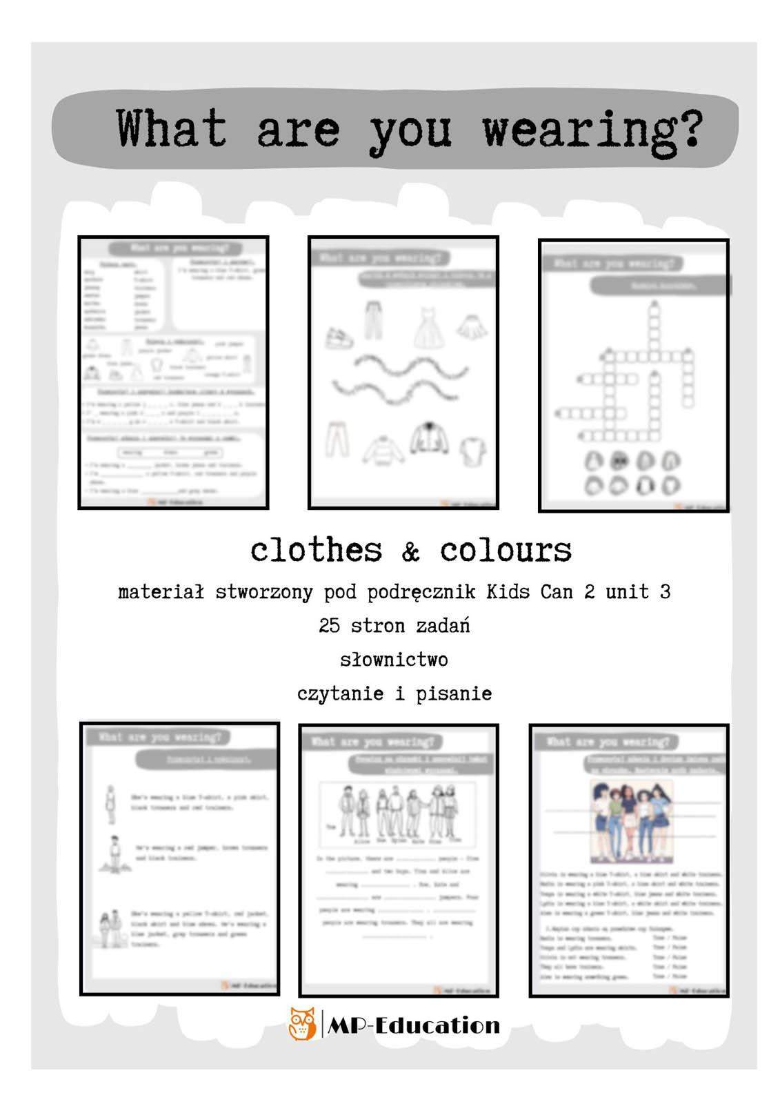Materiał przeznaczony do ćwiczenia nazw ubrań i kolorów stworzone pod podręcznik Kids Can 2. Zestaw to 25 stron kart pracy:
