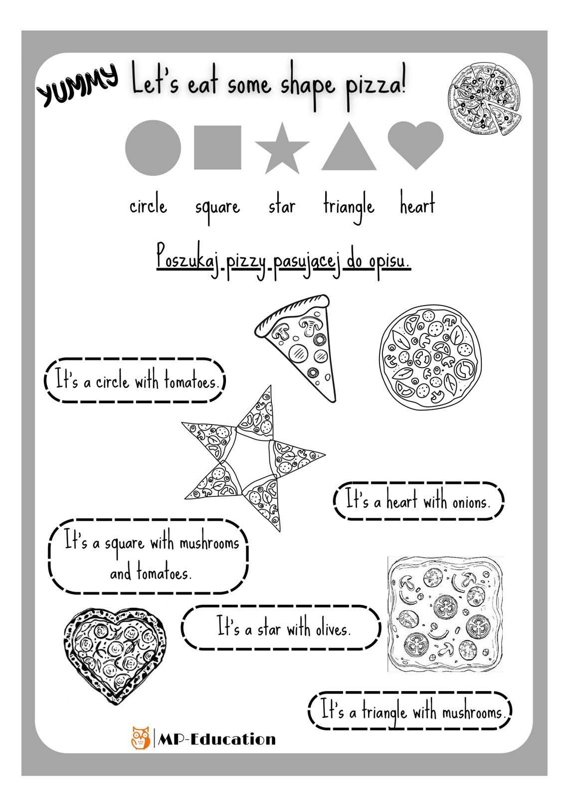 Dzień pizzy to materiał składający się z 14 kart pracy na których poćwiczymy słownictwo dotyczące podstawowych kształtów: circle, square, triangle, star i heart oraz poćwiczymy słownictwo związane z jedzeniem i konstrukcję zdania There is / There are.