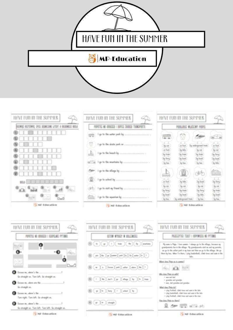 Karty pracy do nauki słownictwa związanego z wakacjami, środkami transportu i pytaniem o drogę. Poprzez zestaw poznamy nazwy wakacyjnych miejsc, nauczymy się pytać o drogę i wskazywać komuś drogę. Zestaw zawiera różne zadania, więc poćwiczymy zarówno słownictwo, jak i czytanie ze zrozumieniem i pisanie.