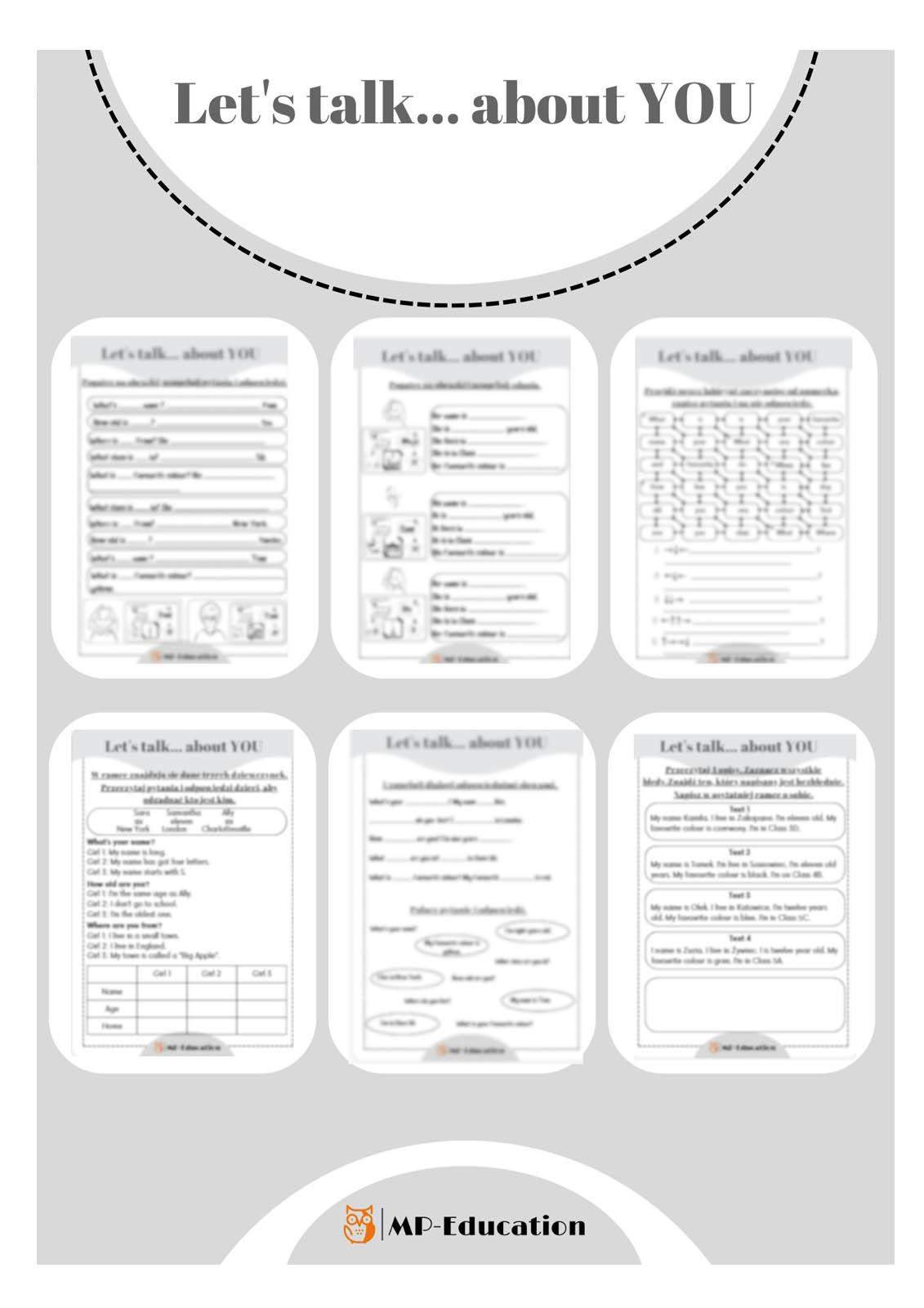 Let’s talk… about you – Nauka podstawowych pytań w języku angielskim i przedstawiania się to zestaw składający się z 22 kart pracy, na których poznajemy 5 podstawowych pytań i uczymy się na nie odpowiadać. Zadania skonstruowane są tak, aby miały różny poziom trudności, są zarówno brakujące wyrazy, dopasowywanie pytań do odpowiedzi, a także wąż wyrazowy lub labirynt.