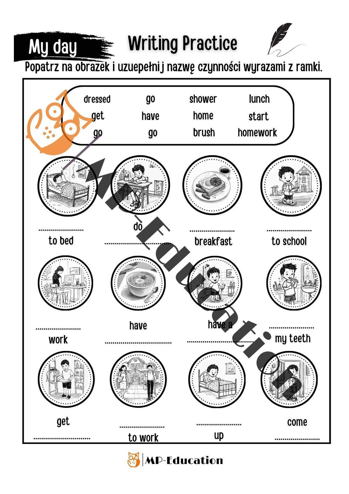 Zestaw zawiera 2 karty pracy, na których uczniowie poznają słowa opisujące czynności dnia codziennego oraz będą mogli przećwiczyć poznane zwroty w zadaniach.