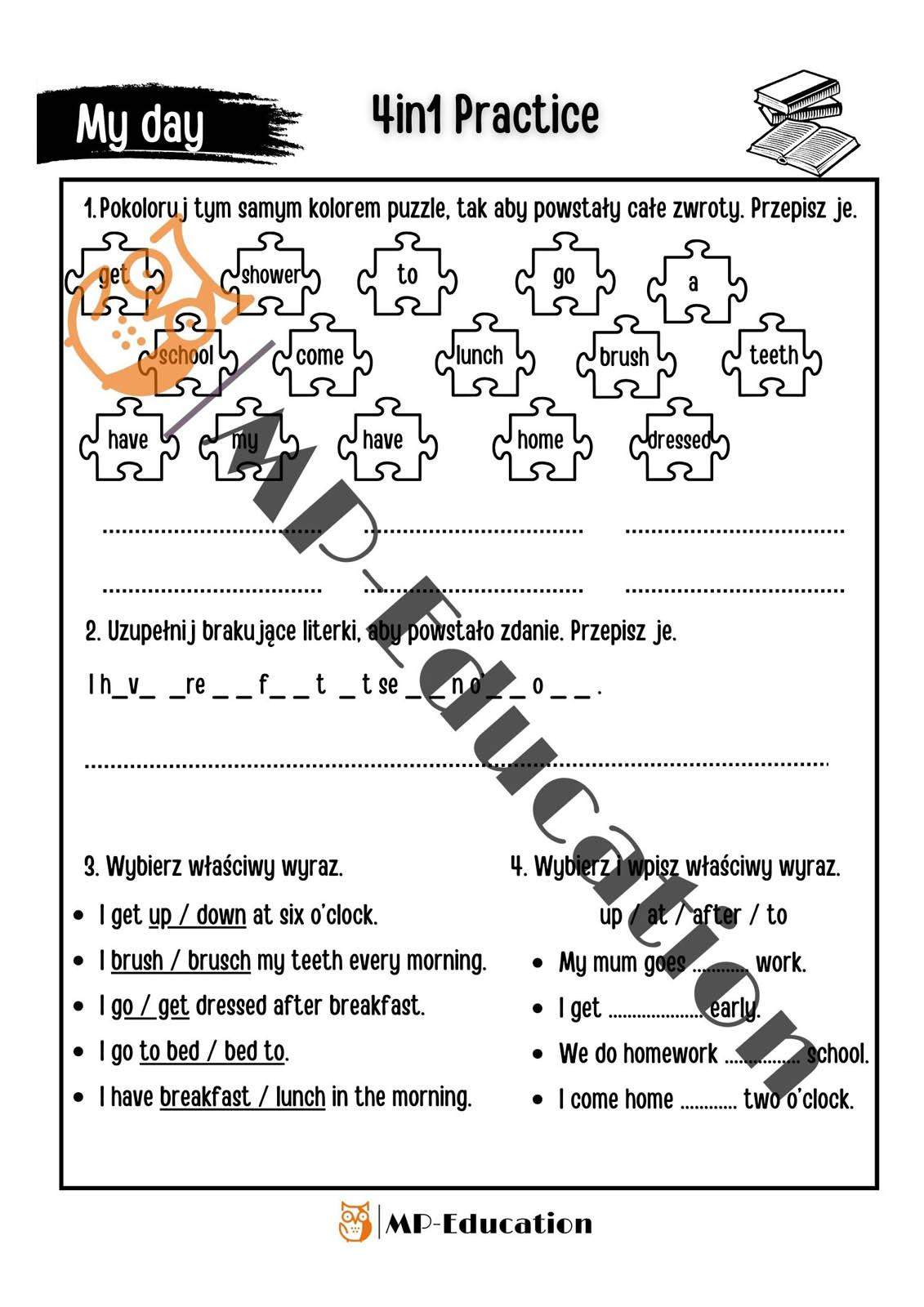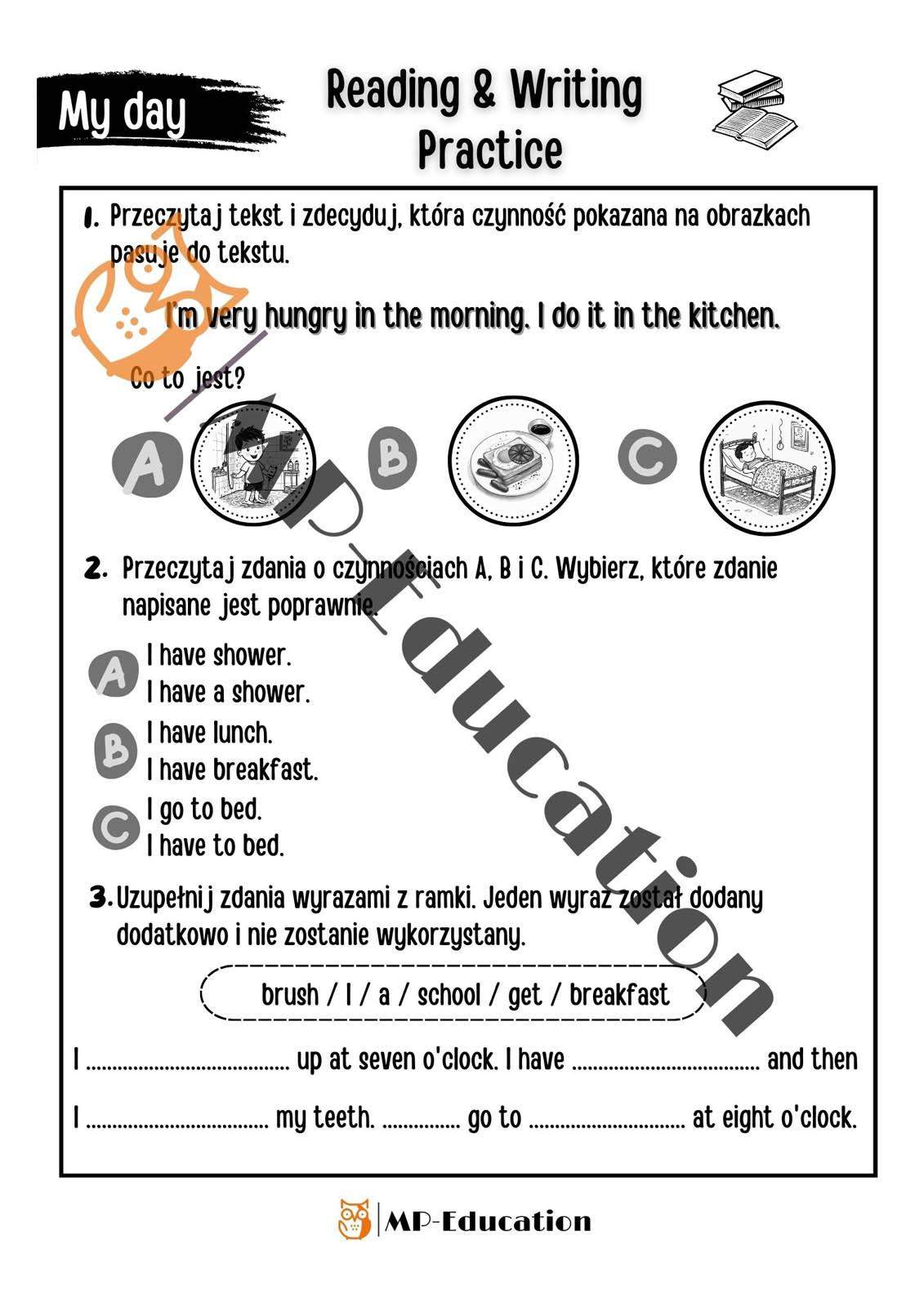 Zestaw zawiera 14 kart pracy, na których uczniowie bardzo dobrze i w angażujący sposób nauczą się pracy z tekstem, przećwiczą czytanie ze zrozumieniem oraz nauczą się opisywać swój dzień. Ponadto, karty pracy zawierają ćwiczenia na podawanie godzin w języku angielskim. W zestawie uczniowie będą mogli zmierzyć się z zadaniami :
