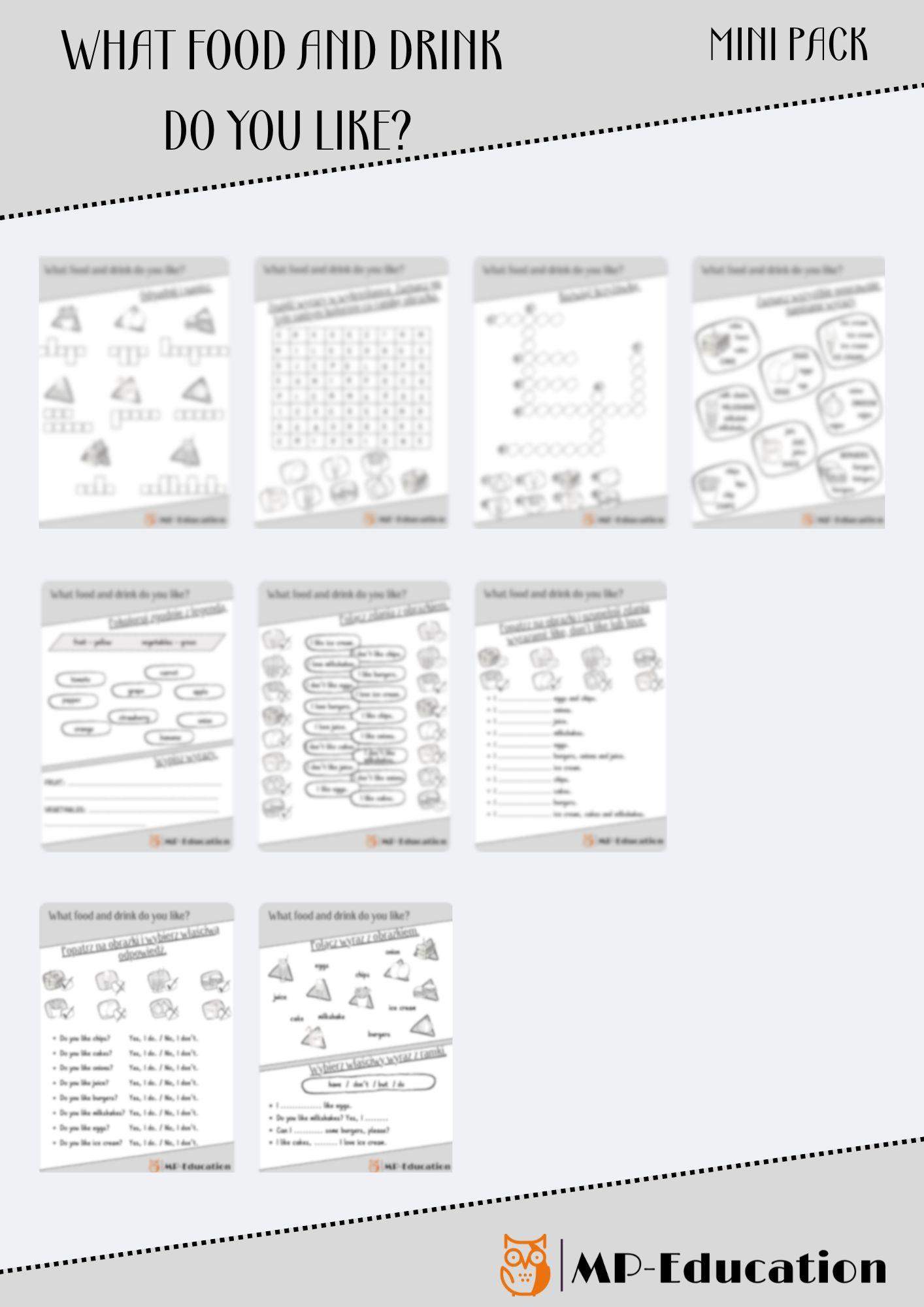 Karty pracy do nauki słownictwa związanego z jedzeniem, mówieniem co się lubi, zadawaniem pytań o to czy ktoś coś lubi oraz proszenie o jedzenie. Zestaw zawiera różne zadania, więc poćwiczymy zarówno słownictwo, jak i czytanie ze zrozumieniem i pisanie.