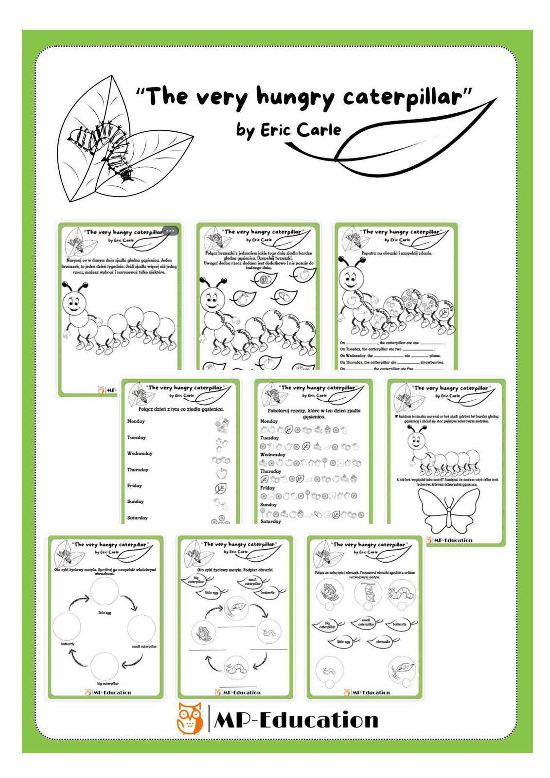 Zestaw 14 kart pracy do pracy po przeczytaniu książki „The very hungry caterpillar” autorstwa Erica Carle’a. Zestaw zawiera zadania przeznaczone dla uczniów młodszych – zarówno tych czytających, jak i tych, którzy jeszcze nie opanowali tej umiejętności, a karty pracy mają różne poziom trudności. Na kartach pracy możemy przećwiczyć nie tylko znajomość i poziom zrozumienia książki, ale również powtórzymy słówka związane z jedzeniem, dni tygodnia oraz poznamy cykl rozwojowy motyla (w dwóch wersjach: łatwiejszej i trudniejszej).
